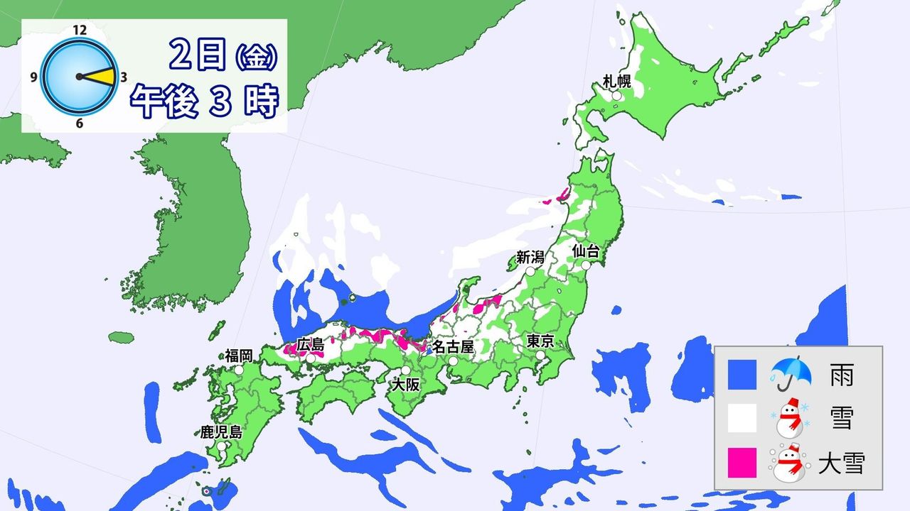 - Example 1: 1月1日から2日にかけて大雪が降るでしょう。 (Gatsu ichinichi kara futsuka ni kakete ōyuki ga furu deshō.) - Heavy snow is expected from January 1st through the 2nd.