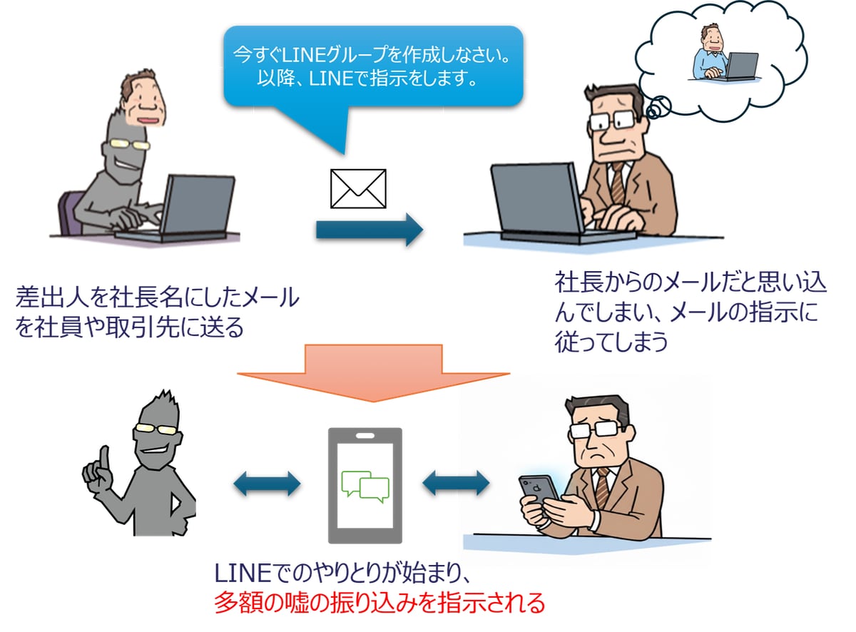 社長をかたるメールが届いた。 Shachō o kataru mēru ga todoita. An email impersonating the president arrived.
